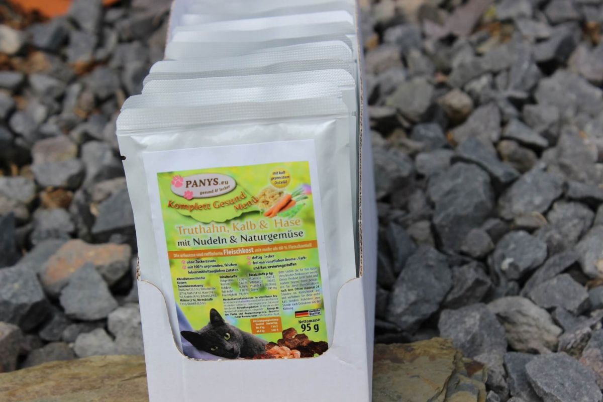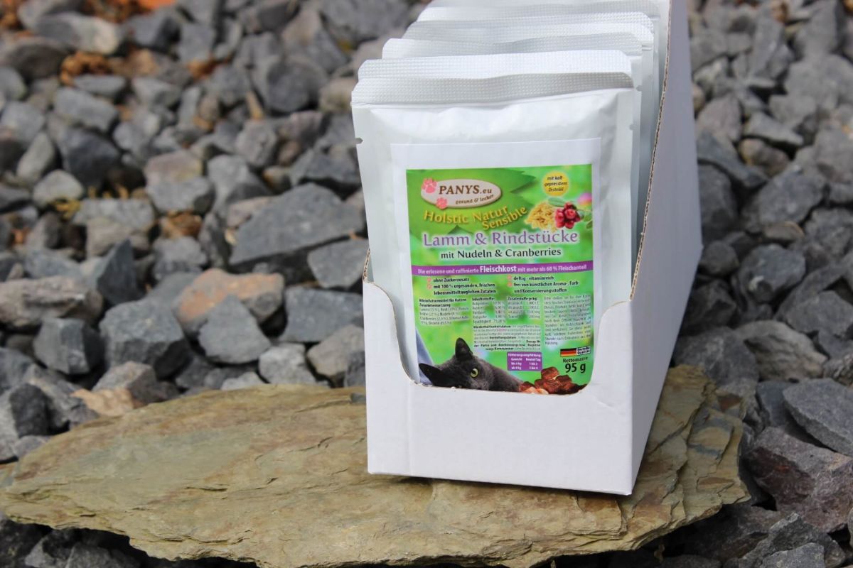 Alle PANYS Menüs im Pouchbeutel gibt es in 95 g und 295 g und sind als Alleinfuttermittel für ausgewachsene Katzen zugelassen. Mit wenigstens 60,0 % Fleischanteil und ohne Zuckerzusatz, sind es ernährungsphysiologisch ausgewogene Rezepturen.
