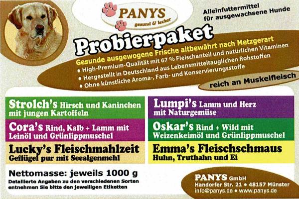 welche der 6 Geschmacksrichtungen mag er am liebsten oder findet er alle Sorten gleich lecker? Der ideale Geschmackstest für alle Hunde und besonders für Hunde die eine Glutenunverträglichkeit haben. Alle PANYS Würste sind für ausgewachsenen Hunde als Alleinnahrung geeignet. Auch Welpen ab dem 3. Lebensmonat dürfen schon die PANYS Wurst bekommen. Allerdings haben Welpen einen höheren Bedarf an Kohlenhydraten, daher sollten Sie bitte Welpen-Trockennahrung zufüttern.Hier erhalten Sie ausschließlich High-Premium-Qualität mit mehr als 60,0 % Fleischanteil, reich an Muskelfleisch und alle als getreidefreie Rezepturen.Hergestellt in Deutschland nach Lebensmittelstandard, ohne zugesetzte künstliche Aroma- und Farbstoffe